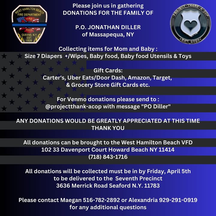 Please consider helping the family of slain NY City Police Officer Jonathan Diller. Our brothers and sisters at West Hamilton Beach Fire Dept. will be collecting donations.. please read the post below carefully.. Please show support to the family of our city's fallen son.. Rest easy Hero! WHBVFD will be partnering with “Project Thank A Cop” & helping collect items which are being donated to Officer Diller’s family. WHBVFD is an official Drop-off site for donation and will be listed as a collection location on their social media as-well. If you or some one you know would like to donate we are located at : 102 33 Davenport Court Howard Beach NY 11414 Please call (718) 843 1716 prior to coming to the station to assure someone will be there. Below are some items that are being asked for - Collecting items for Mom and Baby : Size 7 Diapers & up, Wipes, Baby food, Baby Utensils & Toys. Gift Cards: Carter’s, Local Restaurants, Uber Eats/Door Dash, Amazon ,Target, & Grocery Store Gift Cards #NYPD #firstrespondersstrong #firstresponderfamily #thinbluelinefamily #thinredlinefamily #volunteer #fire #firedepartment #westhamiltonbeachfiredepartment #nyc #nycfire #volunteersinnyc #takinemallon #everyonestartssomewhere #heartofhamiltonbeach #letsgo #doyougotwhatittakes #neighborshelpingneighbors #doitforthecommunity #HowardBeach #OldHoward #rockwoodpark #11414 #support #grateful #firefamily🚒